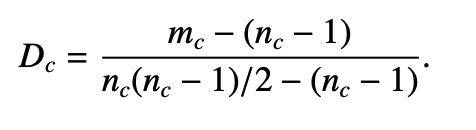 社团密度定义(社团划分的好坏):(社区实际的边数 - 要连通的基本边数) / (全连接社区边数 - 基本边数)